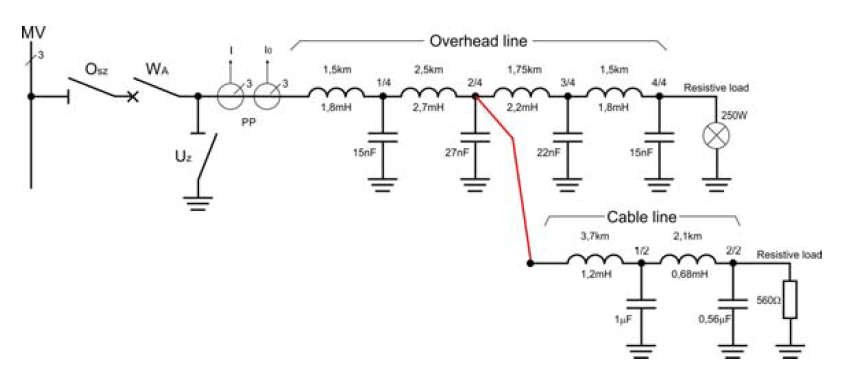 The calculation data were obtained from the line construction data. The values of individual parameters of the line model were determined taking into account: type, cross-section of working conductors, type of slopes (distance between conductors and between conductors and ground) and type of ground. The parameters were determined and a model of MV line was built containing four overhead sections with lengths of 1.5, 2.5, 1.75 and 1.5km. The preload of active power at the end of the simulated line was three 250W bulbs associated in a star. The test stand was equipped with a field controller with a disturbance recorder with a sampling frequency of 1.6kHz (Fig.2).