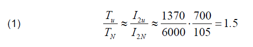The envelope of rotor current is proportional to motor’s asynchronous torque. When motor supply is switched on, surge current appears and it reaches 4.3 IN. When the rheostat is switched and its resistance changes, the current (RMS-value) does not exceed 1.2IN. Rotor’s surge current is equal to 700 A. The impact torque is calculated on the basis of rotor current waveform in the following way: