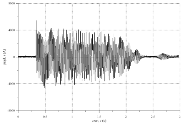 Oscillogram of start-up current for motor rated at 1250 kW, 6 kV is shown in Fig.2. This is motor with electromagnetic excitation and cage start-up winding, the so-called SAS motor. This particular motor is installed in copper ore ball mill.