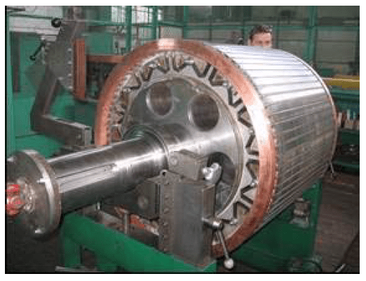 The asynchronous start-up of synchronous motors is most commonly used. Apart from excitation winding present in rotor of synchronous motor, another start-up winding is mounted; usually this is a cage winding. When stator winding is connected to the power network, current flowing in cage winding interacts with stator current and asynchronous torque emerges; this causes the rotor to rotate and accelerate up to near-synchronous speed. At this point, excitation current is switched on and rotor self-synchronizes. The end windings of rotor in synchronous motor with cage winding are shown in Fig.1 (the wrappings have been taken out).