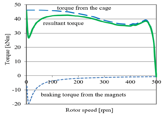 Calculated curves for starting torque of this motor are shown in Fig.4. The rated torque is TN = 21 kNm. On the basis of presented curves, it may be concluded that total start-up torque over entire speed range is greater than rated torque.