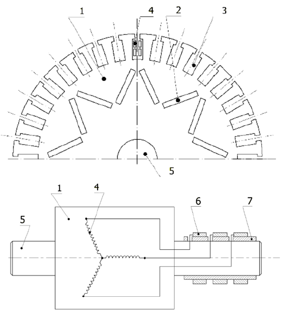 In the magnetic circuit, the copper sleeve 5 is placed in the air-gap. This rotor design is recommended for medium and high power motors. In these machines the air-gap is usually greater than 2 mm and placing a 1 mm thick sleeve in this slot does not pose technological problems. The relative magnetic permeability of copper is the same as of air. Sleeve 5 does not decrease excitation’s magnetic flux, while it ensures attenuation of the rotor hunting.