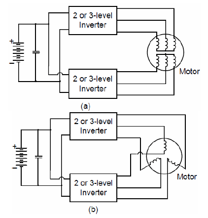 Dual inverter: To increase the power of traction drives, also dual topologies are used (Fig. 12). Both presented topologies parallel and cascaded has the same inverter configuration (2-level or 3-level), but differ only in motor connection. The parallel topology (Fig. 12a) allows to increase power by extend current capability using two converters connected to two sets of three-phase (30 degree phase shifted) or six-phase isolated motor winding. The dual cascade topology allows increasing the output power by doubling the output voltage (Fig. 12b) using two inverters connected in series with motor phase winding. The modulation techniques used in parallel and cascade topology are different. As result of using appropriate phase shift of carrier signal in the modulator, the DC-link capacitor current ripple, and thus the DC capacitor volume, are about 30% lower in cascade than parallel connection [60].