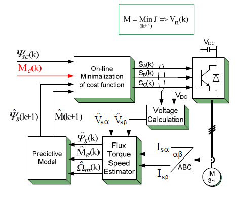 The system contains blocks typical for MPC: flux, torque and speed estimators, predictive discrete model of control plant (motor + inverter),and in every sampling k calculation of cost function minimum. Therefore, the system’s properties depend on the accuracy of the predictive model of the control plant and the formulation of the cost function, which next to the error between measured and predicted values of controlled variable can also contain additional specific components such as the limit of inverter switching number, range of field weakening, losses, thermal models, etc.