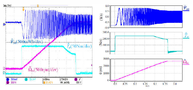 This together with the lack of restrictions on the linearity of the control plant gives a very flexible control in which the process of selecting linear regulators has been replaced by the on-line optimization process. The MPC system can work in the range of over-modulation including square operation, which ensures maximum utilization of the battery DC voltage supplying the inverter. The perfect dynamic behavior of the MPC controlled IM traction drive is presented in oscillogram of Fig. 19 [80, 81]. The disadvantage of predictive methods is the required large number of on-line calculations, however, algorithms that allow their significant reduction are intensively developed [80].
