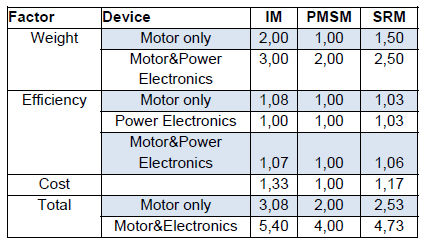 The type of motor to be used in BEVs is generally determined by three main factors: weight, efficiency and cost, and these are compared in the Table 1. In this ranking the best motor was IM in both individually and summed with power electronics.