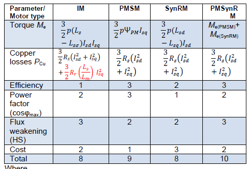 Table 3 presents AC motors used in EV, taking into account additionally such parameters as power factor and field weakening ability. Formulas for torque and losses in windings were also shown. There are visible in IM the losses occurring in the winding of the rotor, which are not present in other types of motors. Hence, the lower efficiency of the IM. The PMSynRM engine received the most points, which is consistent with the results from Table 2.