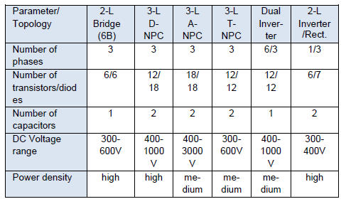Basic topologies of low-voltage converters used in Electromobility are shown in Fig. 10 (Table 5). With regard to traction drives, the two-level bridge (2L-6B) converter topology dominates (Fig. 10a) because is simple and inexpensive standard solution. However, three-level (Fig. 10b-d) topologies have a great potential to improve twolevel converter parameters by reduction of switching losses and volume of passive components as well as better quality of the output voltage [47, 48].