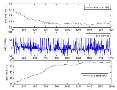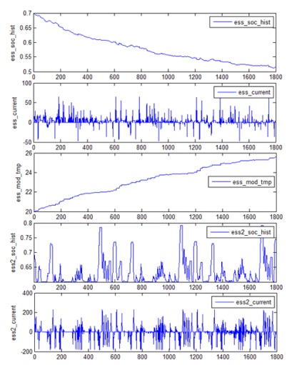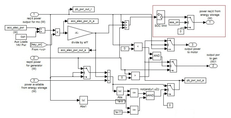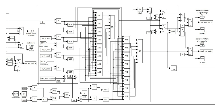 Standard first generation Prius is powered by Ni-MH rechargeable batteries (1.2V cells, 6 cells connected together in a module, 40 modules). The vehicle modification consists in adding an additional energy storage in the form of a supercapacitors package (Maxwell PC2500 – 2700 F 2.5V). The vehicle model includes the mass of the supercapacitors module. The block diagram of the car built in ADVISOR before modification is shown in Fig. 2. Figure 3 shows the power bus model (block ‘prius power bus ‘ in Fig. 2). The block diagram (Fig. 2) and the power bus (Fig. 3) have been modified to add the energy storage. To add a second energy store, the block name and all parameters and variables starting with the prefix ‘ess_’ to ‘ess2_’ have been changed. This was necessary to avoid conflicts with the battery pack model. In the developed strategy for controlling energy storage, the input parameters are: the absolute value of the power for which there is demand at a given moment from energy storage devices (or which is available for energy storage), its sign (a positive value means discharge, and a negative charge, according to the convention adopted in the environment used), restrictions imposed on SOC (state of charge) for both storage tanks and the rate of power change over time (derivative). In addition, the information on which energy storage was previously used is included and restrictions on switching on the battery container are imposed when large instantaneous values of the charging or discharging current are required. This last action is to extend the life of the energy storage, because limiting the on/off cycles also leads to a lower average operating temperature. The possibility of each energy storage unit operation has been taken into account, and with increased power demand at a given moment, as well as in the case of a large amount of recovered power available, simultaneous operation of both tanks is possible, but the preference is always to use the current capabilities of supercapacitors .