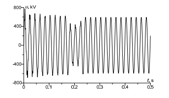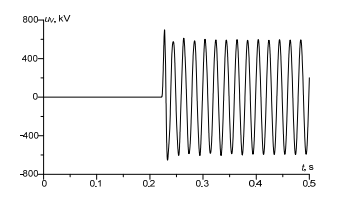 In Fig. 5, voltage between switch’s contacts was presented. It is obvious that in an operating state of the system the voltage value is zero. Next, in the switch activation state, the voltage increases to 750 kV. With contacts disconnection resistance grows, in 0.03 s voltage on contacts equals EMF rated voltage, 630 kV.