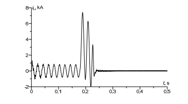 In Figure 6 transient current in power supply line is presented. It can be observed that in operating state of the system, the maximum current value was 0.9 kА, in short circuit state it was 7 kА. When comparing Figures 4 and 6, a difference is observed, the difference may be a result of complex processes occurring on the line end.