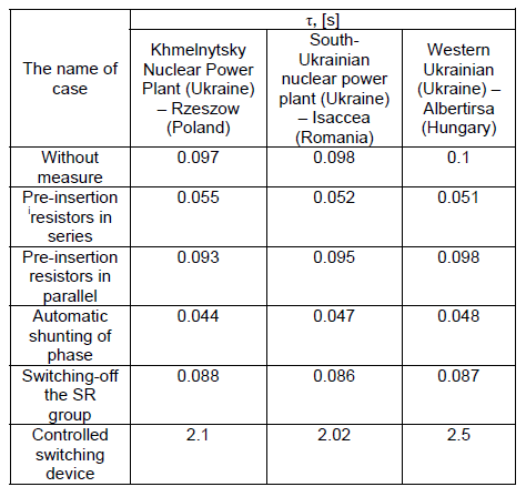 To perform the time constant calculations, the following extra high voltage power line data were adopted. for the next lines Khmelnytsky Nuclear Power Plant (Ukraine) – Rzeszow (Poland), South-Ukrainian nuclear power plant (Ukraine) – Isaccea (Romania), Western Ukrainian (Ukraine) – Albertirsa (Hungary). The resistance is Rpre-ins= 400 Ohms for both cases Fig. 3 a) and Fig. 3 b). In Table 1 are shown parameters of equivalent systems and shunt reactors.