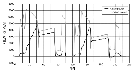 The relatively high engine power of mine hoisting machines with a short and often repetitive cycle of operation makes them as nonlinear loads, with a significant impact on the supply power grid, being the source of higher harmonics and voltage fluctuations [2, 3]. These have a negative impact on the electrical energy quality and may result in financial penalties for failure to meet the appropriate parameters at the point of plant supply. Figure 2 shows an example of the active and reactive power waveforms of the hoisting machine during 2 work cycles.