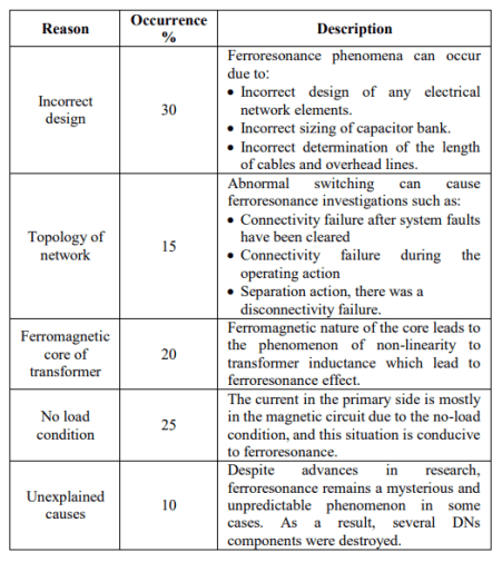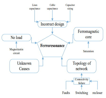 Ferroresonance phenomena can occur in all parts of the electrical network and at any level of voltage [72]. There are many causes that lead to ferroresonance effect. The most important reasons are due to incorrect design, topology of network, the ferromagnetic core of transformer and unexplained causes. Table 2 explains these reasons, their percent and their description [48], [77], [78]. These causes are summarized in the illustrated diagram shown in Fig. 2 [40], [48], [51], [79], [80]. Recently, researchers have demonstrated the role of the transformer tank in increasing the ferroresonance effect [81].