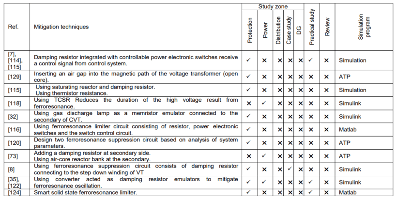 Ferroresonance prevention methods, are all the methods and precautions taken by the electrical network operator to prevent the occurance of ferroresonance in the power system. Table 4 shows the most important precautions taken used to prevent ferroresonance. Ferroresonance mitigation techniques are all the techniques used to restrain the high values of voltage and current resulting from the ferroresonance [58]. Table 5 summarized the most important methods used to mitigate and its method of study.