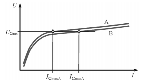 The strongly non-linear character of equation (1) causes that small differences in the parameters of two neighboring characteristics result in large difference of currents for the same voltage on parallel connected varistors (Fig. 10).