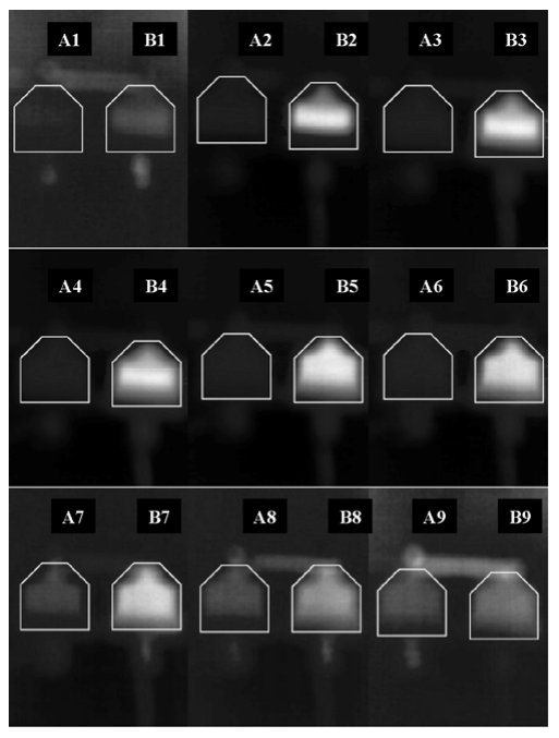 Figure 8 presents plots of the temperatures on the surface of MOSAs A and B, recorded using a measuring system with two K-type thermocouples. A significant temperature difference between these two surge arresters is visible, resulting from significantly different energy dissipated in them. The same effects can be seen when analyzing the results of infrared observation of the housing of the two tested MOSAs. Figure 9 shows the thermal state images of MOSAs A and B surfaces in the time moments corresponding to the points marked on the temperature plots in Figure 8.