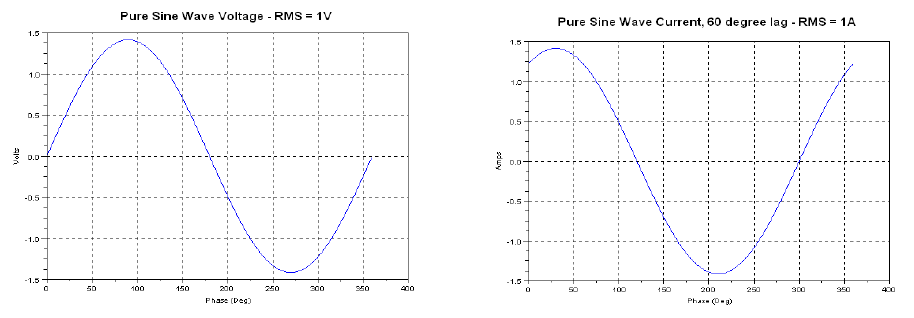 • Sine wave voltage, Sine wave current -60° lag. Current is lagging voltage, simulating an inductor present in the load. This waveform is used as a reality check – all VARs calculations should be scaled by sin(60°), or 0.866.