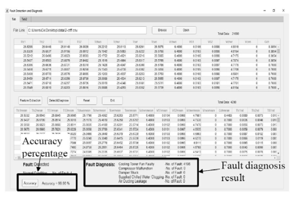 The first part of this project discussed the performance of three machine learning models: decision tree, SVM and KNN for data-driven FDD in a centralised chilled water air conditioning system. All classifiers successfully classified six condition types of one normal condition and five faulty conditions. The faulty conditions were among the common faults in the centralised system. Although all classifier models achieved good performance, the decision tree model is the best among all. The accuracy and precision of the decision tree achieved over 99.9% for both training and testing datasets. The second part discussed the developed GUIs for the FDD system using the trained decision tree model. Both GUIs were able to process and classify the data into their types.