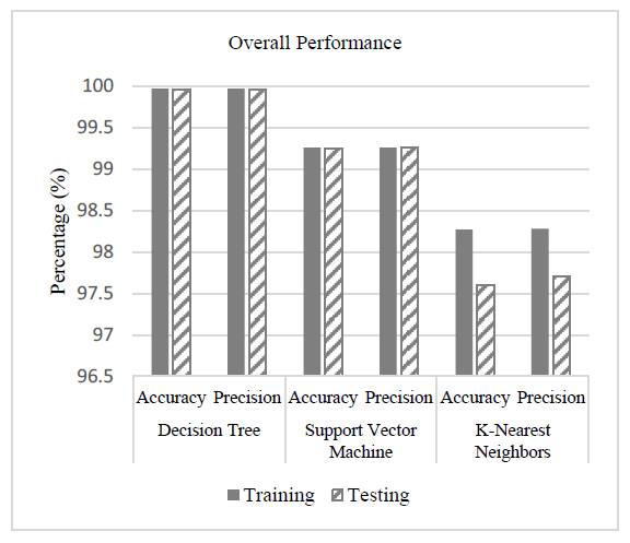 Fig.9 shows the overall performance for the decision tree, SVM and KNN model. The graph clearly shows that all three models successfully classified all types with more than 97% accuracy and precision. The decision tree model has the highest accuracy and precision among all.