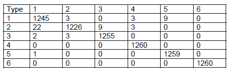 Table 6 and Table 7 show the confusion matrixes for the training and testing datasets of the model. The results show that almost all types have slightly lower accuracy compared to the decision tree model. However, the misclassification rates were only about 0.06% to 2.5%.