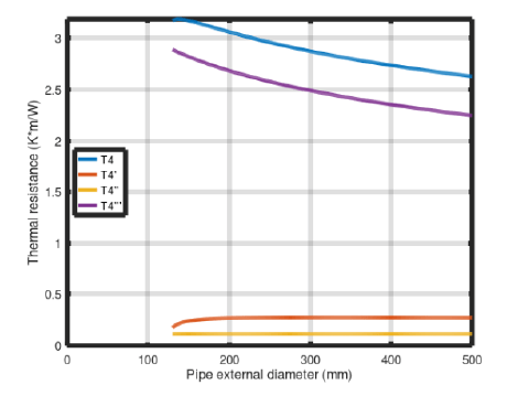 • The external thermal resistance T4“‘ (Fig. 6) decreases with the increasing pipe diameter.