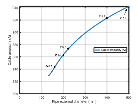 When installing a cable in a pipe-type duct, the internal duct diameter is usually at least 1.5 times larger than the external diameter of the cable [18, 19]. For the investigated case, when the cable external diameter is 99.08 mm (see Table 1), the normalized pipe of PE200, SDR11 or larger should be used (the pipe internal diameter is 163.6 mm and it gives the diameter ratio 163.6/99.08 ≥ 1.5). Such a diameter of the pipe/duct results in the ampacity equal to 863.7 A (see Fig. 8). The increase of pipe diameter to 400 mm gives the ampacity equal to 923.2 A (ampacity increase by around 7%).
