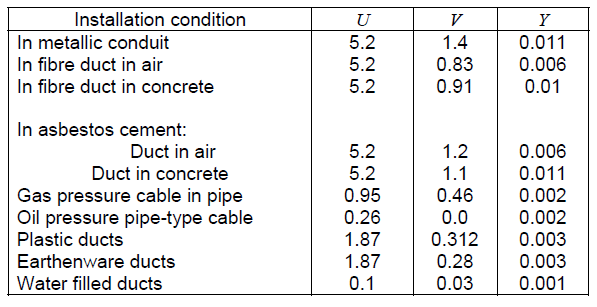 where: De – external diameter of the cable, mm; θm – mean temperature of the medium filling the space between the cable and duct, °C; U, V, Y – constants depending on the type of installation, given in Table 2.