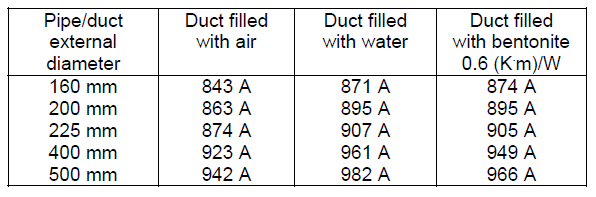 For a wider comparison of types of duct filling, Table 3 also contains the results of ampacity calculations for ducts filled with water and ducts filled with bentonite. One can observe that, for example, the duct of 160 mm diameter filled with bentonite gives the same ampacity as the duct of 225 mm diameter filled with air. Therefore, in some cases (very long and deep cable ducts), it can be more favourable to use a larger diameter of the air-filled duct (the simplest and cheapest solution) than a smaller diameter duct filled with bentonite or water.