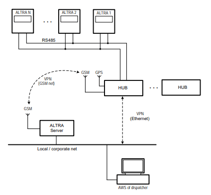 ALTRA-Server consists of a built-in computer and a GSM modem. It collects information from the Hubs installed on the lower level and transmits it to the operator’s AWS for its analysis. ALTRA-Server has a fixed IP address to provide which one can use a SIM-card with a fixed IP address. In terms of controllability, the ALTRA-Server is a passive device. Commands of the Hubs carry out the information transfer to ALTRA-Server, and from the ALTRAServer device to the operator workstation – by the commands of the workstation.