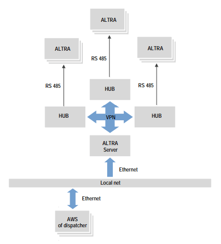 The communication system configuration using VPN technology is shown in Fig. 2. The information network has a two-tier structure. The lower level is formed by digital ALTRA devices installed directly on the object.