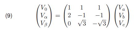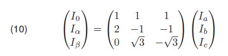 The voltages and currents for the three phase transmission lines are transformed using Clarke’s transformation as the following: