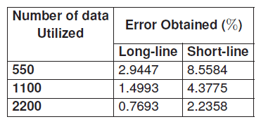 Four experiments were conducted, the split percentages for the two data sets of the fault type and the fault location was 70% to train and 30% to test. The experiments were conducted using successively 550, 1100 and 2200 data as mentioned in Table 3. The first two experiments were for fault type detection for long and short transmission lines whereas the third and the fourth experiments were for fault location for long and short transmission lines.