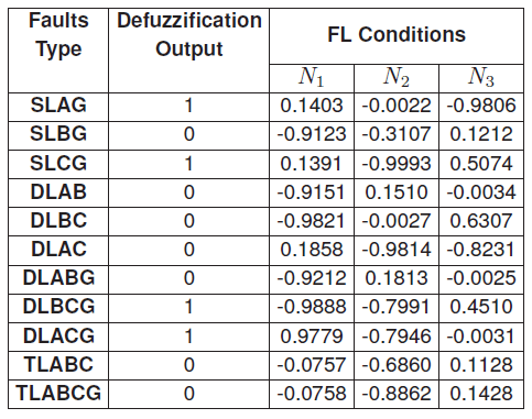 Table 4 and Table 5 respectively present the long and the short transmission line different fault types, as well as the defuzzification outputs obtained after FL conditions were applied. The obtained defuzzification output for DLAB, DLAC, TLABC and TLABCG are found to be approximately Zero. All the input variables which do not satisfy the conditions of FL were considered “Non-Applicable”fault conditions (N/A). The N/A input variables were used to determine the prediction accuracy error.