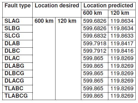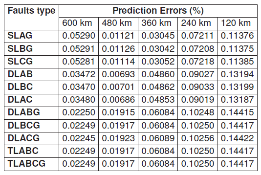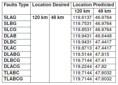 Table 6 and Table 7 show the long and the short line fault type with its location predicted either at 600 km or at 120 km for the long transmission line and at 120 km and 48 km for the short line. Table 8 and Table 9 illustrate the fault location prediction errors for different locations for long and short transmission lines respectively with fault resistance of 0.001Ω and fault angle of -2.0892 degrees.