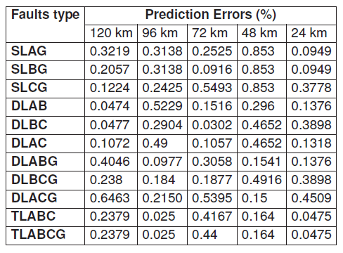 The fault locations errors were determined using equation 16. Comparing these two tables, it can be seen that at 120 km distance in Table 8, the obtained prediction errors are less than the 120 km distance in Table 9. This could be because of the nature of the utilized dataset.