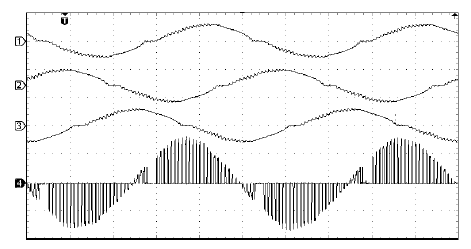 The proposed control method has been applied in three-phase AC voltage controller with zero lead. This controller consists of three identical circuits shown in Figure 1. The tests have been run for different load parameters, transistor pulse frequencies and pulse-duty factors of control signals. The load currents (1,2,3) for different phases as well as load voltage (4) corresponding to load current (1) are shown in Figure 3. The tests have been conducted for transistor pulse frequency equal to 2 kHz, pulse-duty factor of control impulses equal to 25%, and time delay of transistor switching in relation to supply voltage and load current signs detection signals equal to 1 ms.