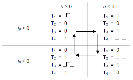 Table 1 shows different states of signals controlling the transistors, in accordance with supply voltage and load current signs. The arrows mark the direction of transition between different operating conditions of the circuit.
