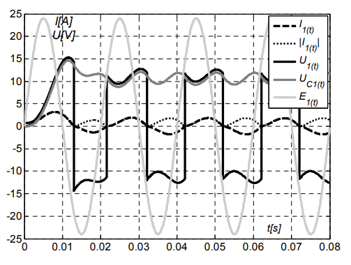 The waveforms of voltages and currents in circuit are shown in figures 7-9. The circuit parameters are as follows: supply voltage Es=24V, series inductance Lk=30mH and Rk=1mΩ in each phase. It was assumed that C1=C2=C3=2mF and RL1=RL1=RL1=15Ω. Forward voltage of the diodes are 0,7V. The switching frequency of the transistors T1 and T2 is equal 10 kHz with duty cycle 50 %. Series resistance of the transistors and diodes is 0,1 Ω. Simulations were carried out with a constant step time equal to 1μs.