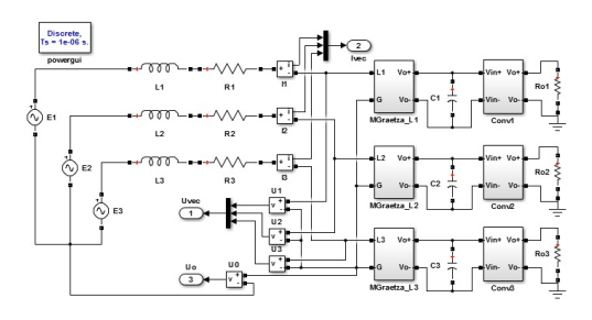 Simulation of circuit from figure 2 was carried out in MATLAB/Simulink system. The SimPowerSystem package was used. The diagram of circuit created in Simulink is shown in figure 5. Blocks MGraetza_L1, MGraetza _L2 and MGraetza _L3 include bridge rectifiers connected in star. Rectifiers are supplied from balanced source AC voltage through inductances Lk and resistance Rk, where k = 1,2,3 and is the phase number. Balanced three-phase voltage source created with voltages source and phase shiftment equal 120°. The output ports Ivec, Uvec, Uo – are respectively vectors of instantaneous values phase current, voltages on the rectifier by AC side and voltage potential difference between the center points of the power source and the load. The DC-DC converters are denoted by Conv1,Conv2 and Conv3 blocks. The outputs of these converter are loaded by resistors RL1, RL2 and RL3. These resistive loads are connected by common ground, isolated from rest of the circuit. The diagram of isolated DC/DC converter from figure 3 in Simulink is presented in figure 6.