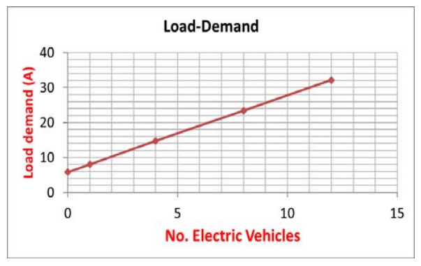 A higher number of connected vehicles raises power demand; hence, the current requirement increases linearly. Fig. 12, depicts the current drawn as a function of the increase of connected vehicles. The second bus supplied a 5.812 A current without any electric vehicle on the network; however, a one vehicle addition increased current to 8.01 A, while 32.14 A was drawn when twelve vehicles were connected.