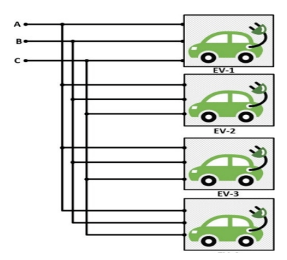 • Case C: This scenario considers a charging station connected to the electrical system; the station is configured with four electric vehicles. The station is attached to the second bus. System model and simulation are performed using the electric vehicles and charging stations, as depicted in Fig.6. This scenario used four electric vehicles to understand the consequences of higher vehicle loads on the electrical system.