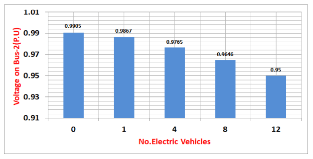 Fig. 9, indicates that when no vehicles are being charged, the voltage levels on the electrical network are within acceptable limits. one-vehicle addition caused the voltage to reduce to 0.9867 P.U., while the voltage fell further to 0.9765 P.U. on the second bus as four electric vehicles were connected to the network. Moreover, voltage levels of 0.95 P.U. are observed when twelve vehicles charge using the power system; this is a critical measure that falls beyond the acceptable limit. Put differently, a higher number of connected vehicles cause a more significant voltage deviation, triggering unacceptable voltages.