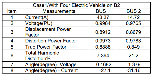 Table 4, indicates that total harmonic distortion degrades further, i.e., from 7.394% in case three to 10.87% for the first bus in the present case. The second bus has similar observations, where THD degrades to 23.66%, indicating higher total harmonic distortion as the connected electric vehicle load increases. The system power factor degrades to 0.8812 in the current scenario, from 0.8888 in the previous observation corresponding to the first bus. In the case of the second bus, we see that the distortion power factor deteriorated to 0.9731 in the fourth scenario from 0.9783 in the second. The higher power actual in the second case is attributed to the higher active power drawn by the system than the more reactive power drawn by the electric vehicle charger. In the second bus context, connecting the charging station reduced voltage to 0.9646 P.U. from 0.9765 P.U., as highlighted in Table (3,4).