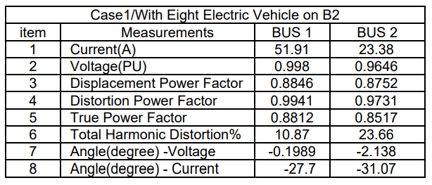 Fig. 5 depicts this scenario comprising one connected vehicle. Table 2. lists the simulation outcomes for this case. Table 2. indicates that this scenario has 2.435% total harmonic distortion compared to zero in the first case. Similarly, the second bus records 10.74% total harmonic distortion (THD). Power factor follows a similar trend, decreased to 0.8996 in this case, compared to 0.9039 for the first. The second bus follows similar trends due to nonlinear electrical loading by the vehicles, increasing system THD, and reducing the power factor, as specified in Table 2. When the electric vehicle is connected to the system, the second bus voltage reduces slightly, as specified in Table 2.