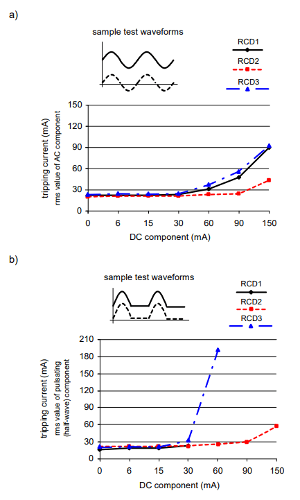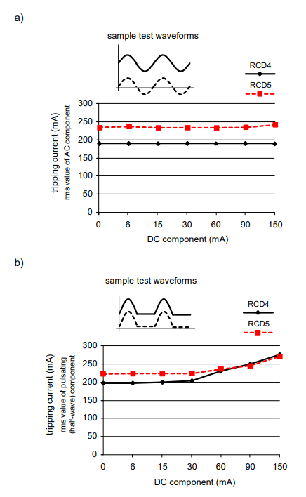 If a DC component appears in the residual current waveform, it influences the tripping threshold of RCDs. For this reason, the standard [3] contains a provision that in some cases it is necessary to use B-type RCDs (as given in section ”Provisions of standards”).