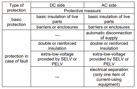 • for protection in case of a fault – the automatic disconnection of supply on the DC side, electrical separation on the DC side, non-conducting location (both on DC and AC sides).