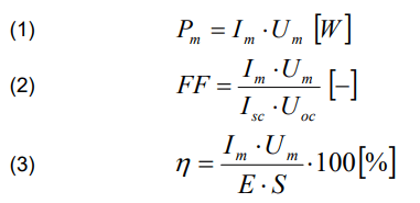 where: Pm – maximum power [W], Im – current at maximum power point [A], Isc – short-circuit current of a circuit [A], Um – voltage at maximum power point [V], Um – open circuit voltage [V], FF – fill factor [-], η – photovoltaic conversion efficiency [%], E – irradiance [W/m2], S – active surface of the PV roof tile [m2].
