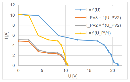 • the PV1 and PV2 roof tiles may function normally and generate higher values of currents and voltages, as they are not limited by PV3,
