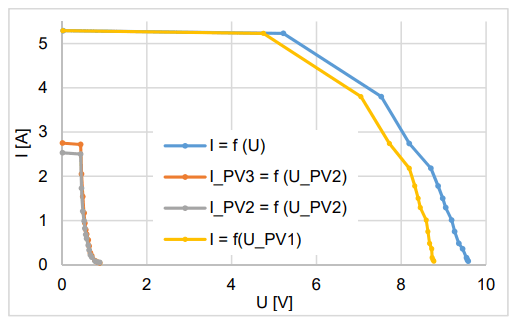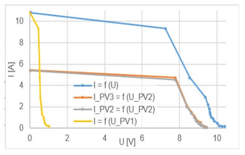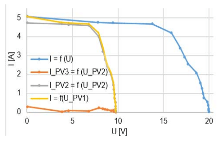 When analysing graphs I = f(U) of three unshaded PV roof tiles in a series-parallel connection, presented in figure 11, it is possible to notice that currents I_PV3 and I_PV2 are almost equal to each other, which means that the uniform propagation of current I takes place in the parallel chain. These roof tiles generate maximum short-circuit current at the given irradiance, which means that the resultant short-circuit current is equal to 10.14 A and flows through the PV1 roof tile connected in series. As the PV1 tile cannot operate at such a value of current (higher than the maximum current generated by it) a characteristic “curve” is noticeable as the voltage increases and its value is determined at the level of the short-circuit current of a single roof tile (about 5 A). This means that at the maximum power point, the PV1 tile determines the value of the current flowing in the circuit, dissipated to the two tiles from the parallel configuration (PV2 and PV3), which will be limited to about 50% of their power. Since there is no shading and all the tiles are uniformly illuminated, the voltages U_PV1 and U_PV2 are equal to each other (10.49 V and 10.67 V, respectively) and the total system voltage is their sum (21.15 V). The value of power generated at the maximum power point is equal to 81.55 W.